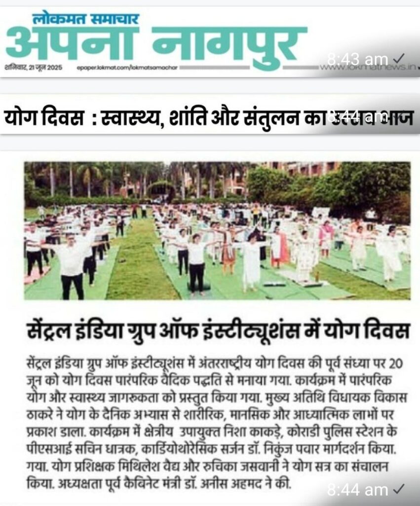 Yoga Day Celebrated in Central India Group of Institutions Central India Group of Institutions celebrated International Yoga Day on June 20, 2025, in anticipation of the global observance of same on June 21. The celebration was marked by a holistic health and wellness program, seamlessly blending traditional yoga practices with vital health awareness initiatives.